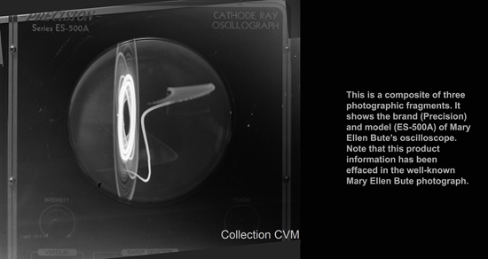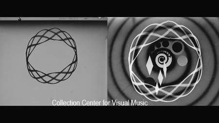 "By turning knobs and switches on a control board I can 'draw' with a beam of light with as much freedom as with a brush. As the figures and forms are produced by light on the oscilloscope screen, they are photographed on motion picture film. By careful conscious repetition and experiment, I have accumulated a 'repertoire' of forms. The creative possibilities are limitless. By changing and controlling the electrical inputs in the 'scope an infinite variety of forms can be made to move in pre-deterrmined time rhythms, and be combined or altered at will." From Mary Ellen Bute, "ABSTRONICS: An Experimental Filmmaker Photographs the Esthetics of the Oscillograph" in Films in Review Vol 5. No 6 (June-July 1954). CVM Note: Bute's Oscilloscope was a Precision Series ES-500A (more detail below).